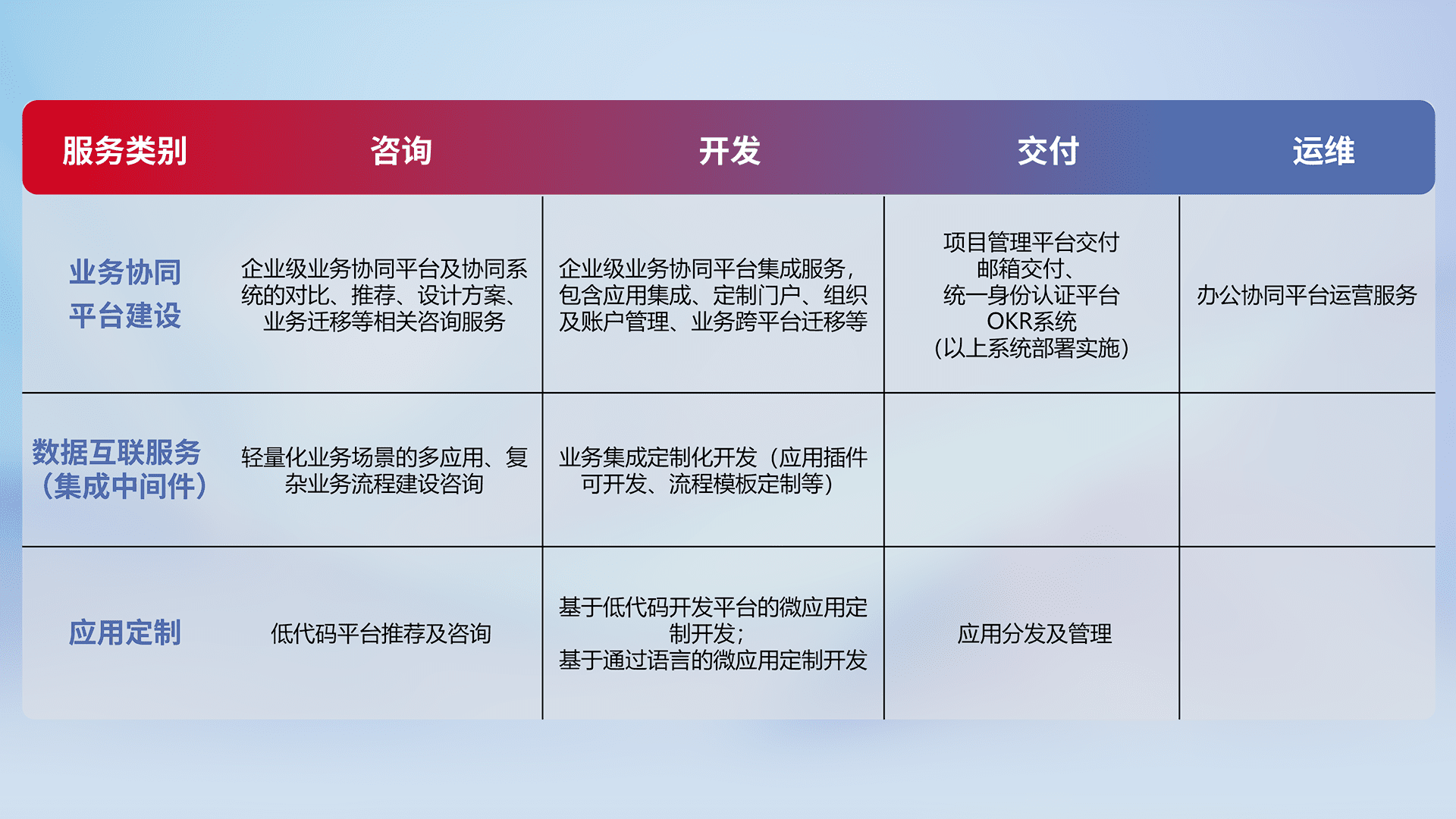 针对钉钉、、企微、、IDaas等平台级产品提供产品的规划、、、、方案、、交付、、定制化开发等服务,,,,实现如统一协同办公、、智能客户服务、、混合会议管理、、、智能数据查询、、、等业务场景,,,实现数字化转型。。